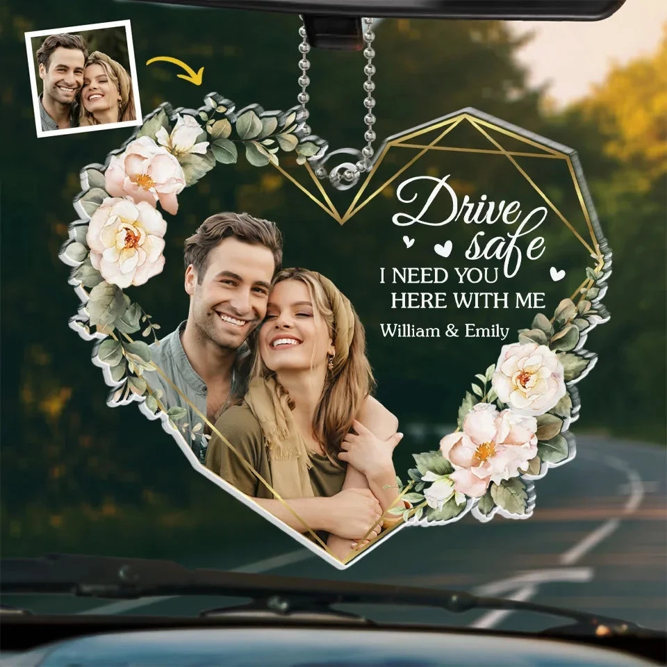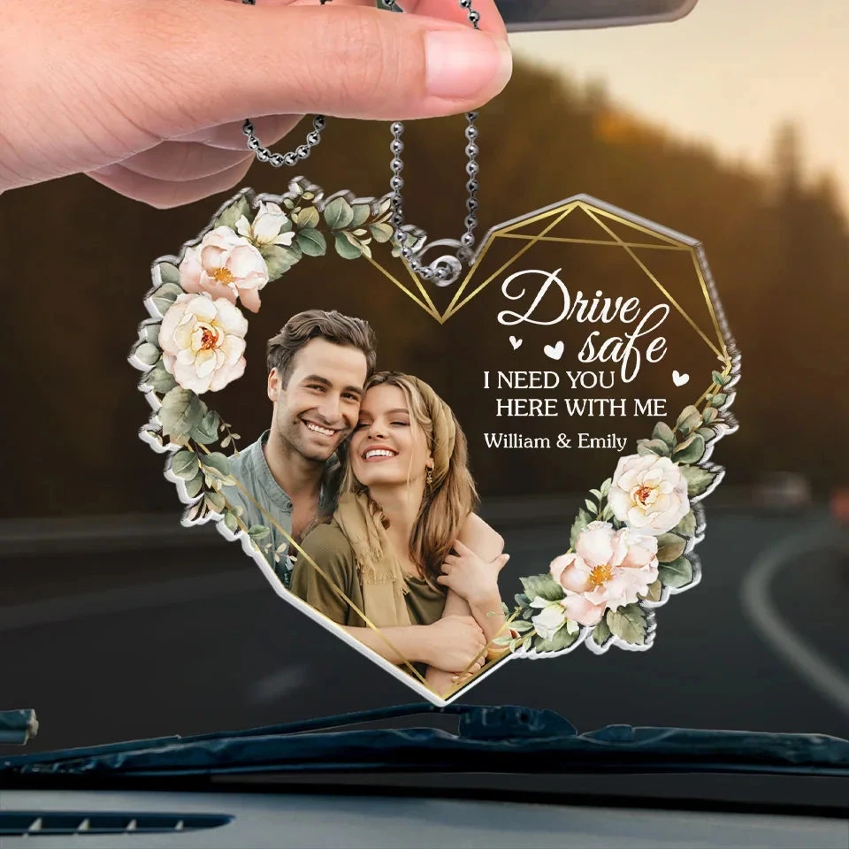 Custom Photo Drive Safe, My Heart Rides With You – Couple Personalized Custom Car Ornament – Acrylic Custom Shaped – Gift For Husband Wife, Anniversary